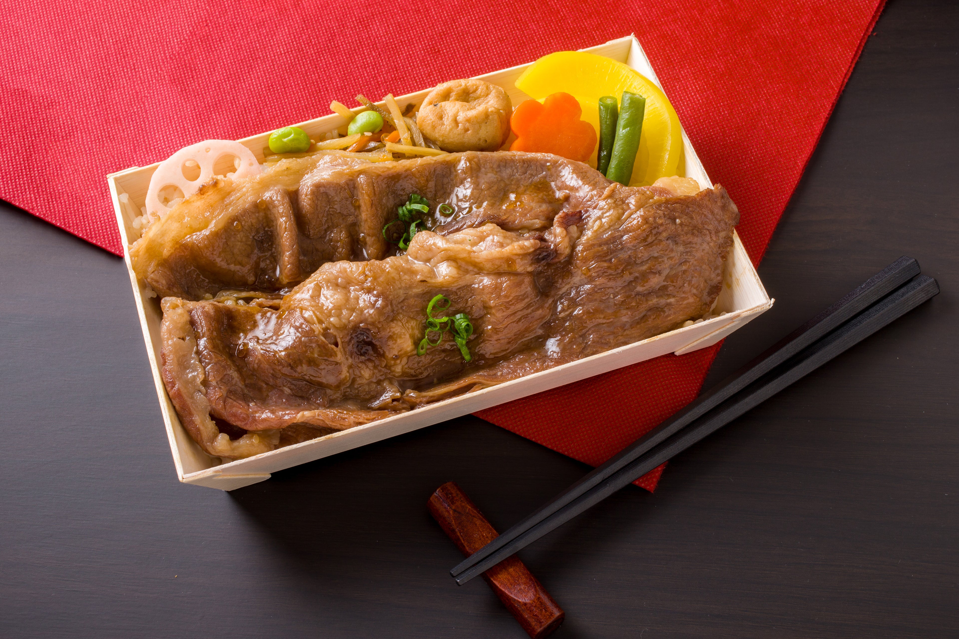 千葉牛ステーキ、味噌漬け焼豚、鶏もも西京焼き弁当