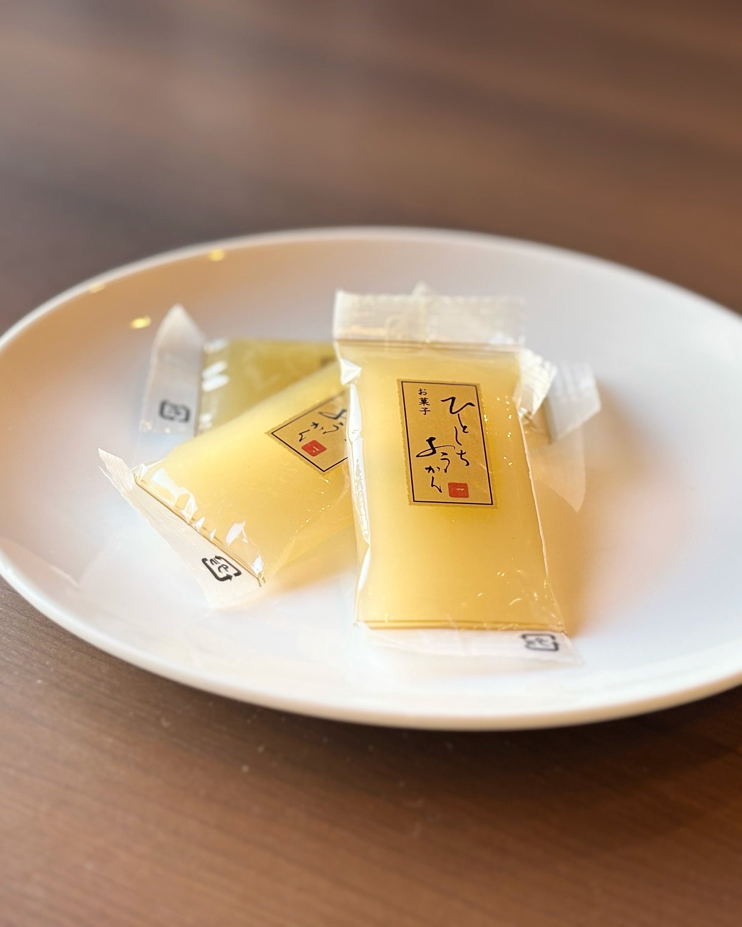千葉県産の和梨を使った一口サイズのようかんをお付けします。