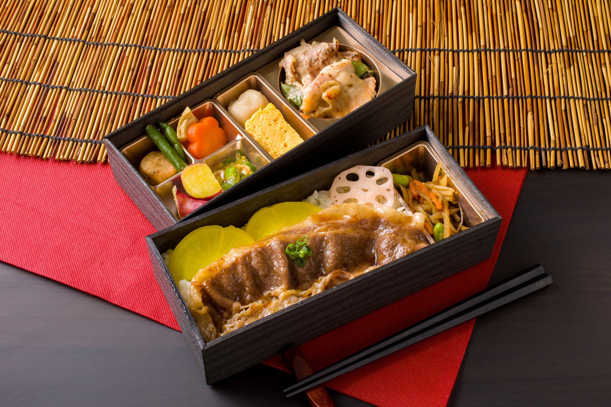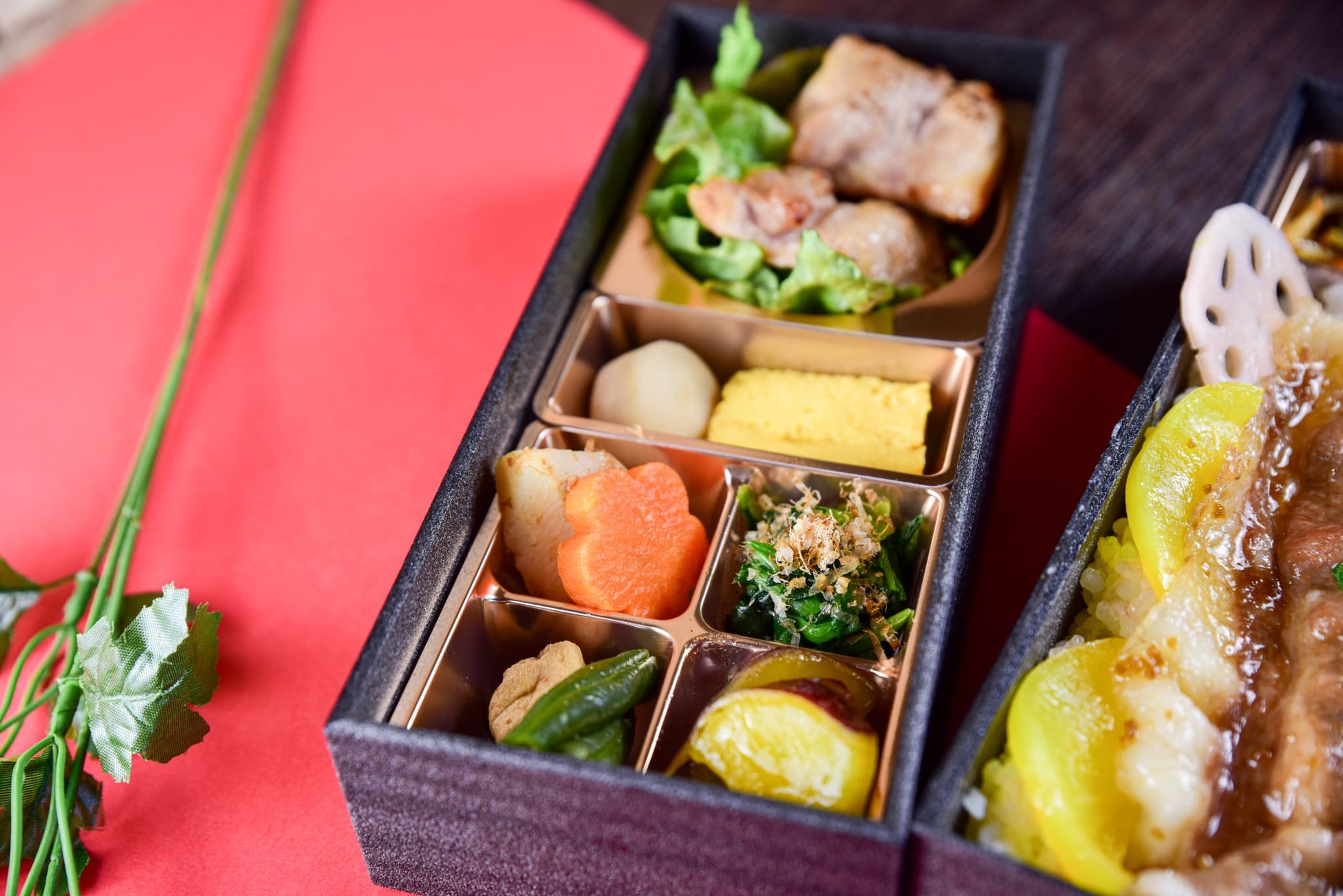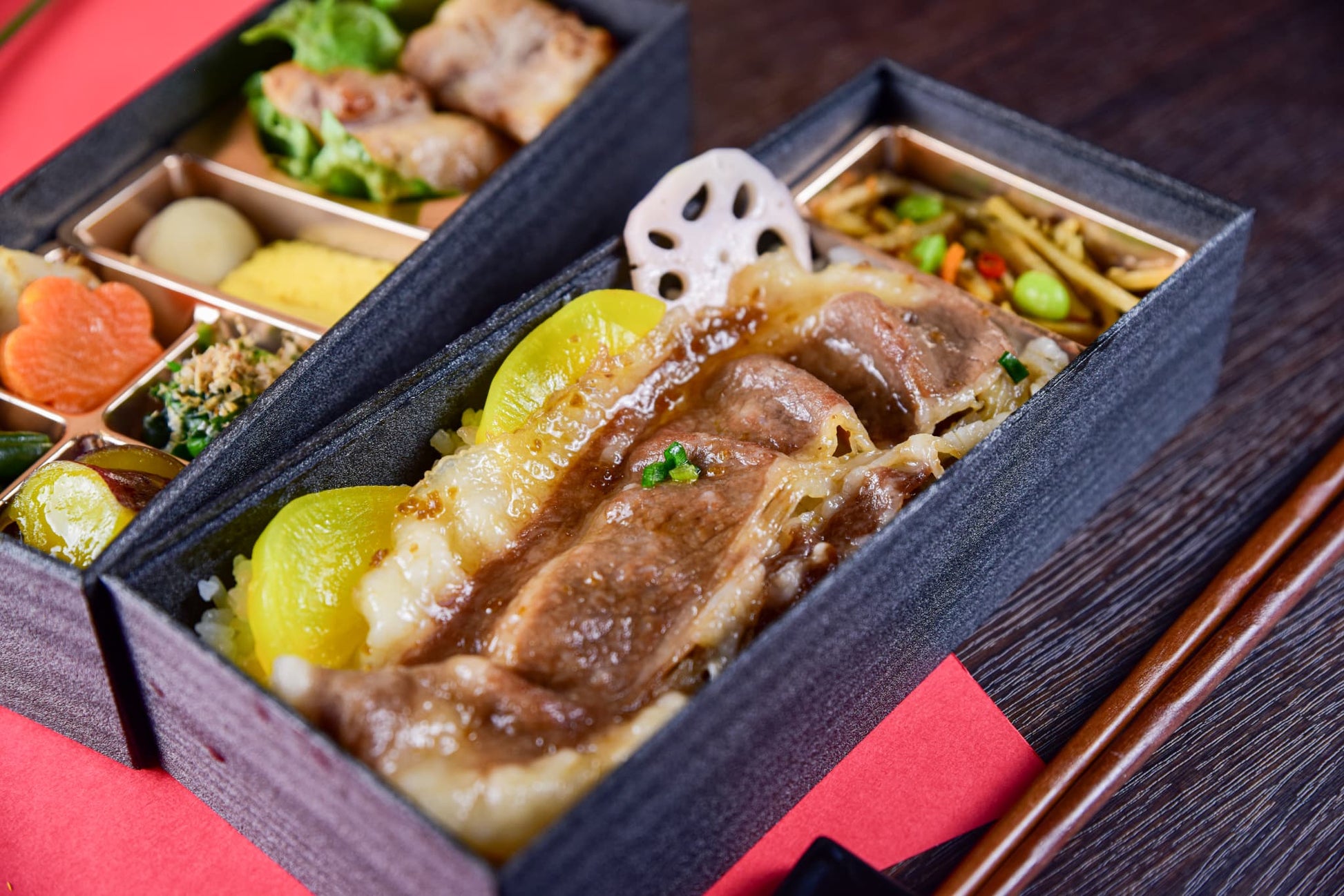 黒毛和牛すき焼きはイタリア産の黒トリュフと醤油・みりん・砂糖を黄金比で合わせた特製の割下を使い、肉の甘さを引き立てるよう、丁寧に焼き上げています。しっとりと柔らかく、噛むほどに旨みが滲む仕上がりです。その他にも煮物や厚焼き玉子など定番のおかずもたっぷりと加えた彩り豊かな二段重です。