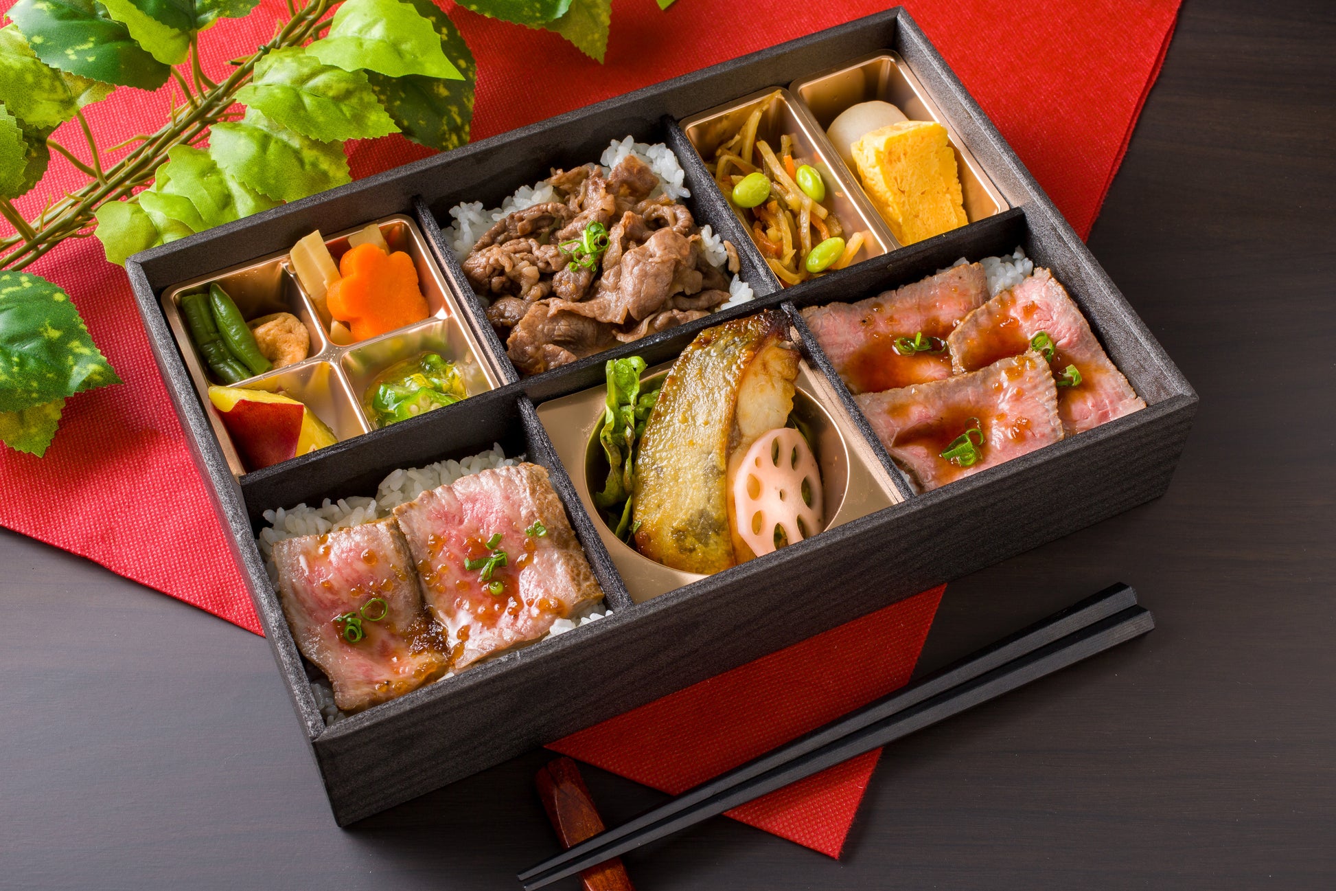 ステーキ・ローストビーフ・すき焼きの三種類のお肉と銀ひらすの西京焼きが味わえる贅沢御膳。